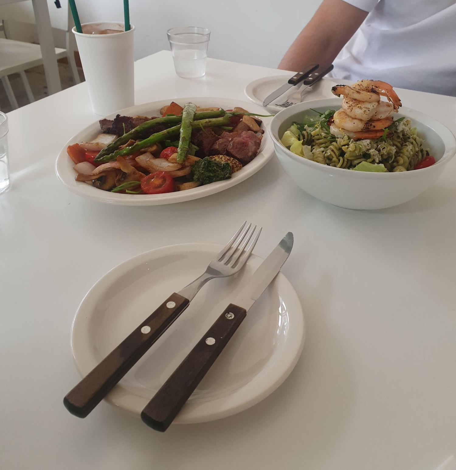 새우 샐러드와 채끝 스테이크 그리고 당근 찹찹 주스를 주문했어요!