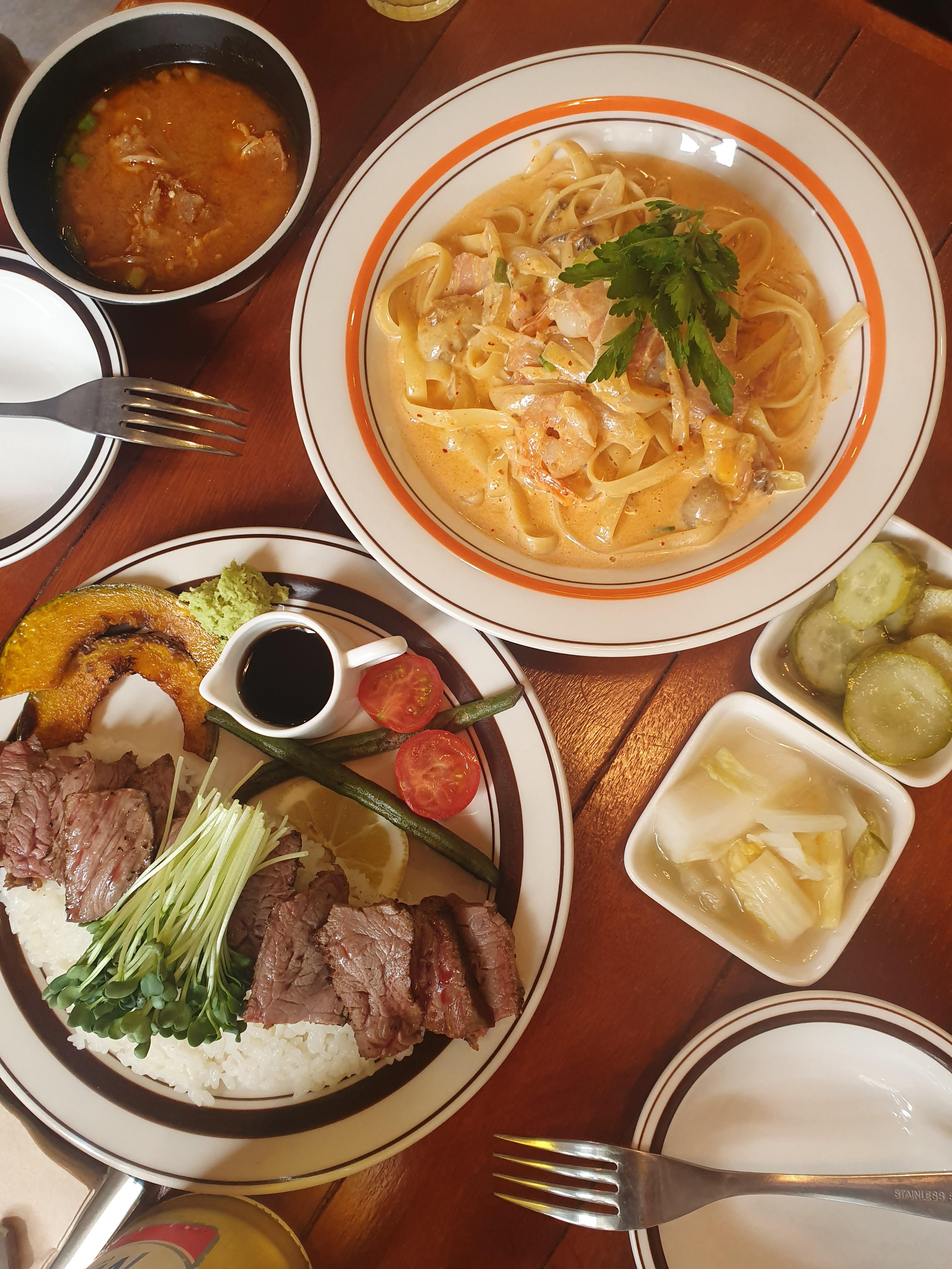 먼저 동성로 교동에 위치한 양문이 식당이에요. 주문한 메뉴는 스테이크밥과 투움바파스타에요. 이 메뉴로 많이들 드시는데 그런 이유가 있어요..정말 맛있어요 이 조합👍 살짝 꾸덕한 투움바 파스타와 통통한 새우를 한 입 먹으면 진짜 행복해요ㅠㅠ 스테이크도 야들야들 함께 주는 소스를 뿌려서 밥고 함께 먹으면 되어요! 같이 가는 일행들도 언제나 맛있게 먹어줘서 제가 만든것도 아닌데 괜히 뿌듯했었네요🤭